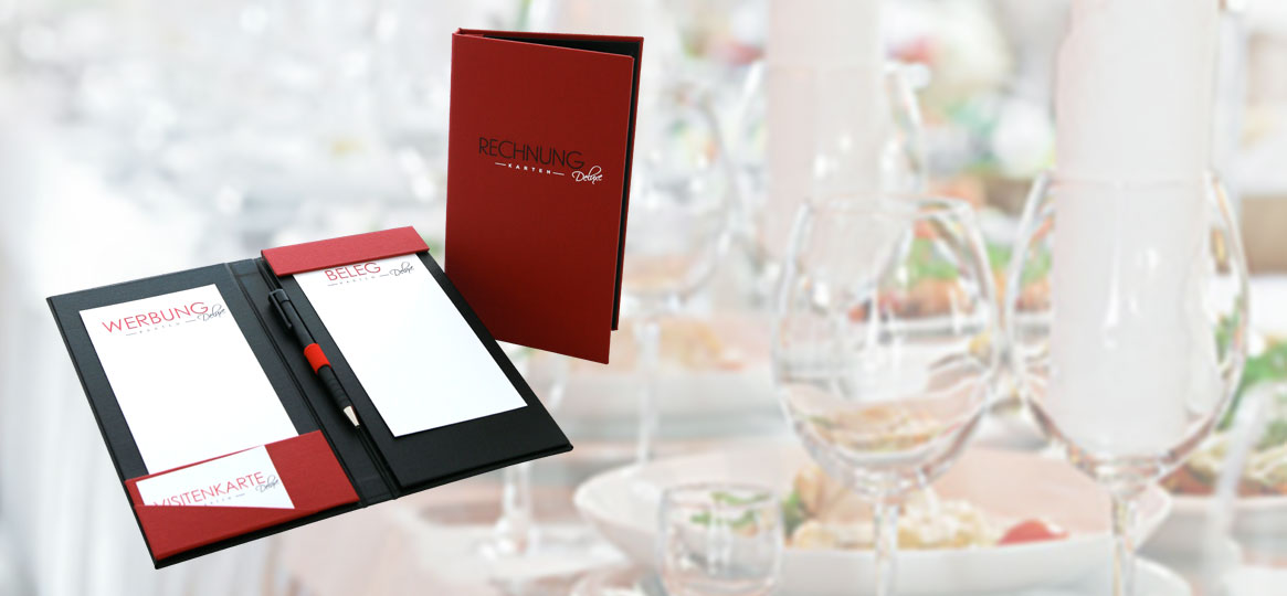 Eine Rechnungsmappe kann mehr als nur dem Gast stilvoll den Beleg überbringen. Setzen Sie Ihre Mappe auch als Webeträger ein und bieten Sie Ihrem Gast bei Übergabe der Rechnung Ihre Visitenkarte und/oder Ihren Flyer zur Mitnahme an. Wir fertigen Stecktaschen in Leisten- oder Dreiecksform an. Die Tasche kann an einer der Längsseiten oder an der Fußseite des Spiegels fixiert werden. Die Farben der Stecktasche und des Spiegels sind unabhängig voneinander auswählbar. Die Seite für Werbung ist standardgemäß links in der geöffneten Rechnungsmappe, kann aber auch rechts erfolgen.