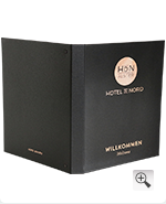 Zimmer und Suiten von dem Hotel du Nord sind mit unseren Zimmermappen und Aufstellern ausgestattet (Bild 1+2). Die Zimmermappen haben eine Innenausstattung mit einer schwarzen 4-er Ringmechanik, einer Kombination aus Einschubtasche und einer darauf liegenden dreieckigen Visitenkartentasche (Bild 3+4). Der Bezug der Mappe ist komplett Englisch Buckram, dieses Material lässt sich gut und unkompliziert pflegen. Vier Prägungen mit einer kupferfarbigen Heißfolie befinden sich auf dem Vorder- und Rückdeckel der Mappe (Bild 1+2). Die Mappe wurde für das Abheften von Din A4 Seiten hergestellt. Die Aufsteller sind dienen zur Info über den Inhalt der Minibar. Eine Seite der Aufsteller trägt eine Tasche im DIN Lang Format (Bild 5), die andere Seite eine kupferfarbige Prägung des Logo Schriftzuges (Bild 1). Auch der Aufsteller wurde in schwarzen Englisch Buckram gefertigt und lässt sich mühelos und platzsparend zusammenklappen und durch die Magnetwirkung schnell unproblematisch wieder aufrichten.