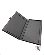 Die Wahl der Menüs erfolgt durch eine Platte der Serie Cumin. Die Weine werden in unserer Weinkarte der Serie Mango präsentiert. Diese ist mit schwarzen Passepartout-Einlegern ausgestattet, in denen Ihre Inhalte sehr elegant zur Geltung kommen. Bis zu zehn Einleger finden in der Mango ihren Platz. Zum Abschluss eines Menüs kommt die Rechnung in unserer Rechnungsbox Schalotte. Mit der Rechnungsbox haben wir die diskrete Rechnungsübergabe an den Gast, die so im stilvollen Rahmen dargeboten wird. Die Platte Cumin wurde mit dem Material Acero bezogen. Eine schwarze Klemm-Mechanik sitzt am Kopf der Pallte. Die Weinkarte und Rechnungsbox sind komplett in Englisch Buckram eingekleidet. Eine zweifarbige Prägung des Logos ziert die Vorderdeckel der Mango und der Schalotte.