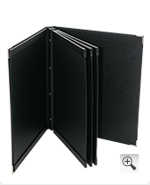 In Dortmund liegt das Ristorante Rossini. In diesem italienischen Restaurant kommen unsere Karten mit Buchschraubengelenk zum Einsatz. Die Buchschrauben sind auf dem Gelenk sichtbar. Zusätzlich haben die Karte Stecktaschen im Innenbereich des Vorder- und Rückdeckels. Im Buchraubengelenk befinden sich drei Träger mit je zwei Stecktaschen. Alle Stecktaschen sind mit transparenten Deckblättern, zum Schutz der Inhaltsseiten ausgestattet. Metallecken schützen die Ecken der Karten. Bezogen wurden die Karten mit Recyclingleder in Safia Optik. Eine Klischeeprägung des Logos und der Weinflasche in silber und grau, wurde auf dem Vorderdeckeln der Speise- und Weinkarten platziert.