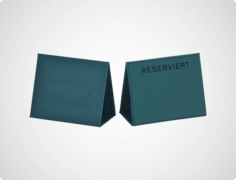 Der "Reserviert" Schriftzug ist geprägt und kann durch eine farbige Folie zusätzlich betont werden. Dabei haben Sie die Wahl aus vielen Farben und können verschiedene Effekte erzielen. Setzen Sie auf einen harmonischen Look oder schaffen Sie zwischen Materialfarbe und Prägefolie einen spannenden Kontrast, der die Blicke auf sich zieht.